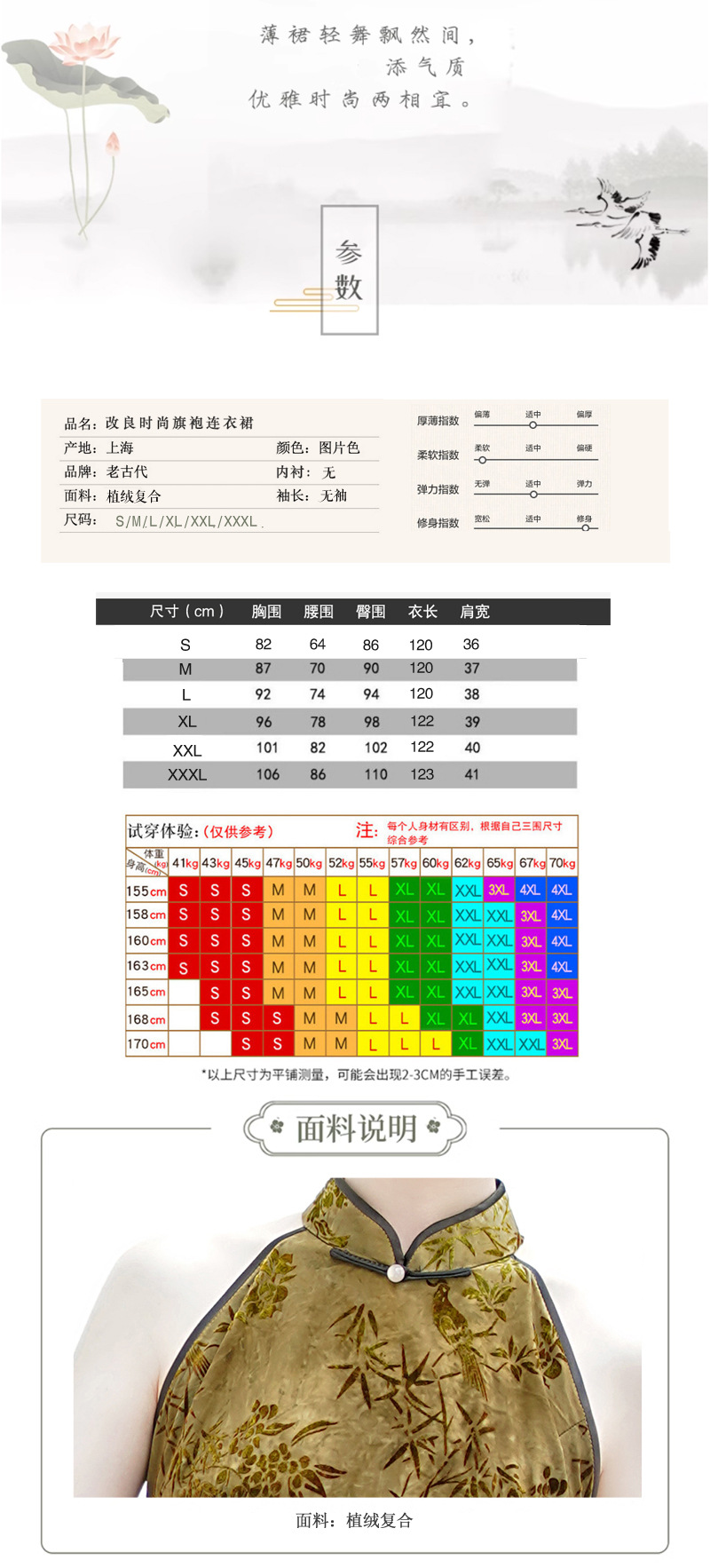 Friendly Reminder: As each cheongsam is individually hand-cut, there may be a slight variation of approximately 1–1.5 cm in measurements due to manual handling. All measurements are in centimeters. Please also note that minor color differences may occur due to lighting conditions during photography.